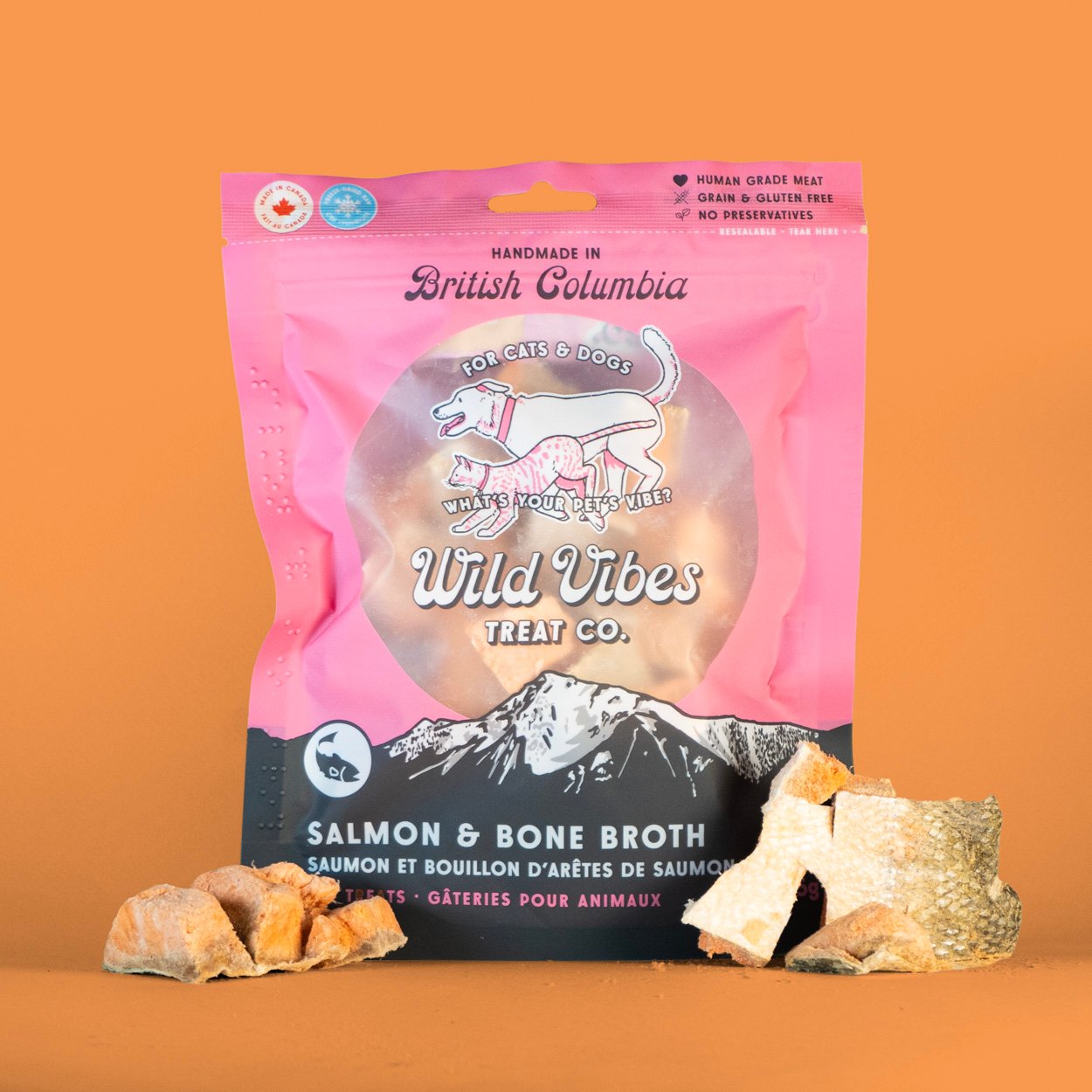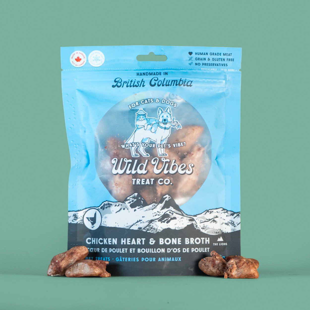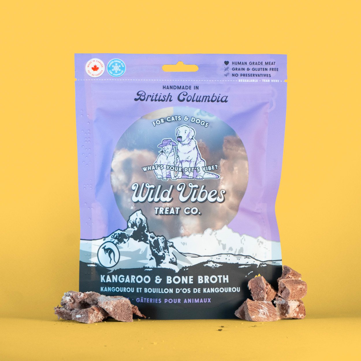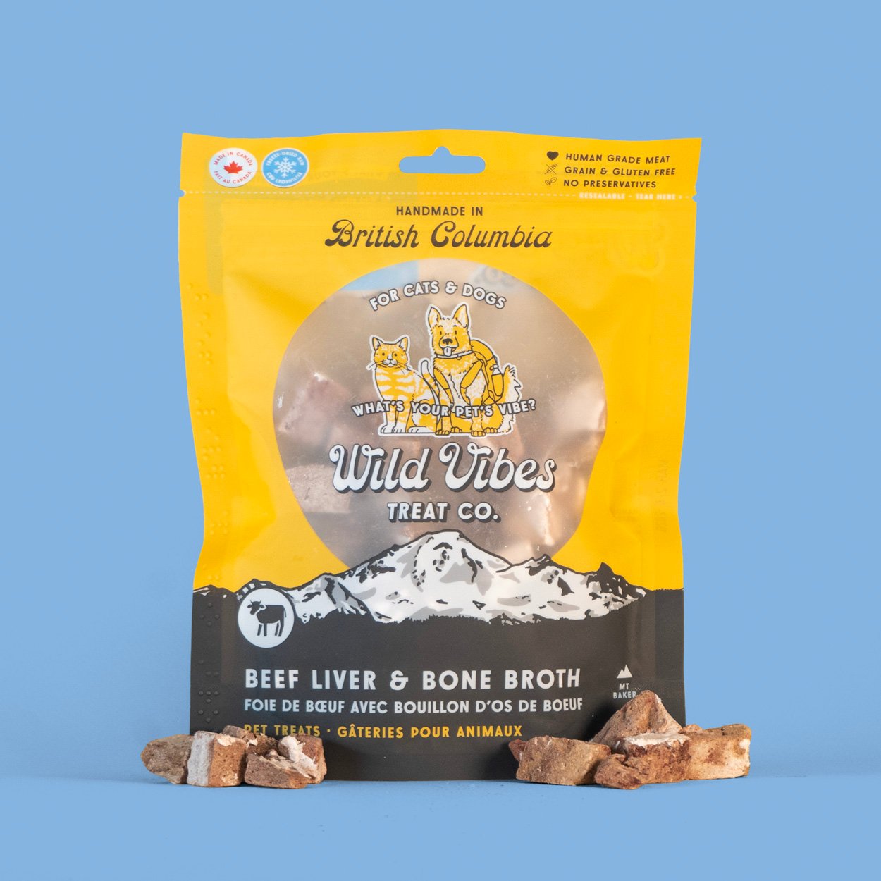 Branding & packaging for Wild Vibes Pet Treats, a dog & cat treat company based in Vancouver, British Columbia. Designed a package of products that feature fun illustrations of pets & local landmarks while making them feel like a cohesive unit when displayed on shelves.